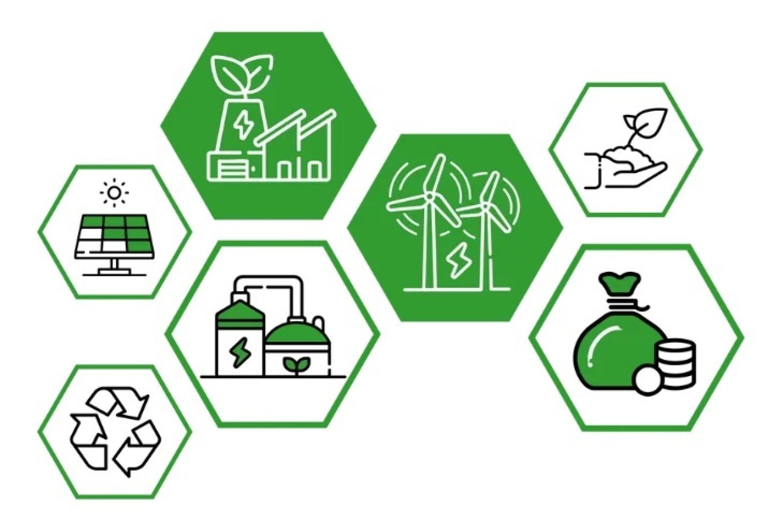 • ikony paneli fotowoltaicznych, wiatraków, recyklingu